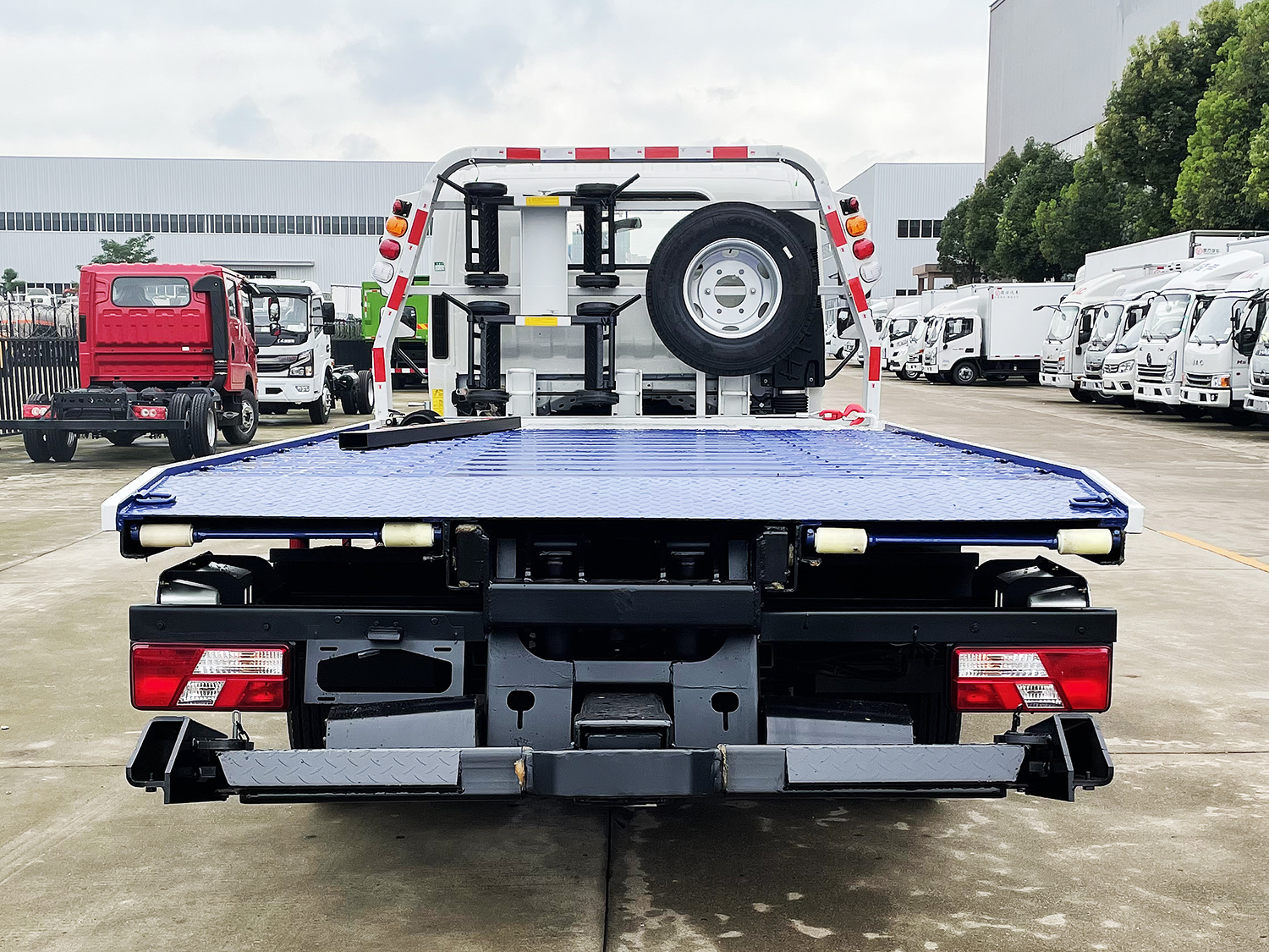 藍牌上裝配置:沖壓式伸縮板,液壓翻轉常規托舉裝置,平板可承載4噸以?xún)戎匚?,主板長(cháng)4~4.2米,折疊、伸縮或翻轉部分1~1.35米,平板總長(cháng)可達5.1~5.35米,雙側聯(lián)動(dòng)操作裝置,后工作燈三只,1個(gè)40KN液壓絞盤(pán)(25米鋼絲繩)一個(gè)工具箱一個(gè)洗手箱,配兩個(gè)**小車(chē),四根新式綁帶,鏈鉤1條,L型抱胎架一對,托叉和托叉座各一對,帶2噸后托臂。